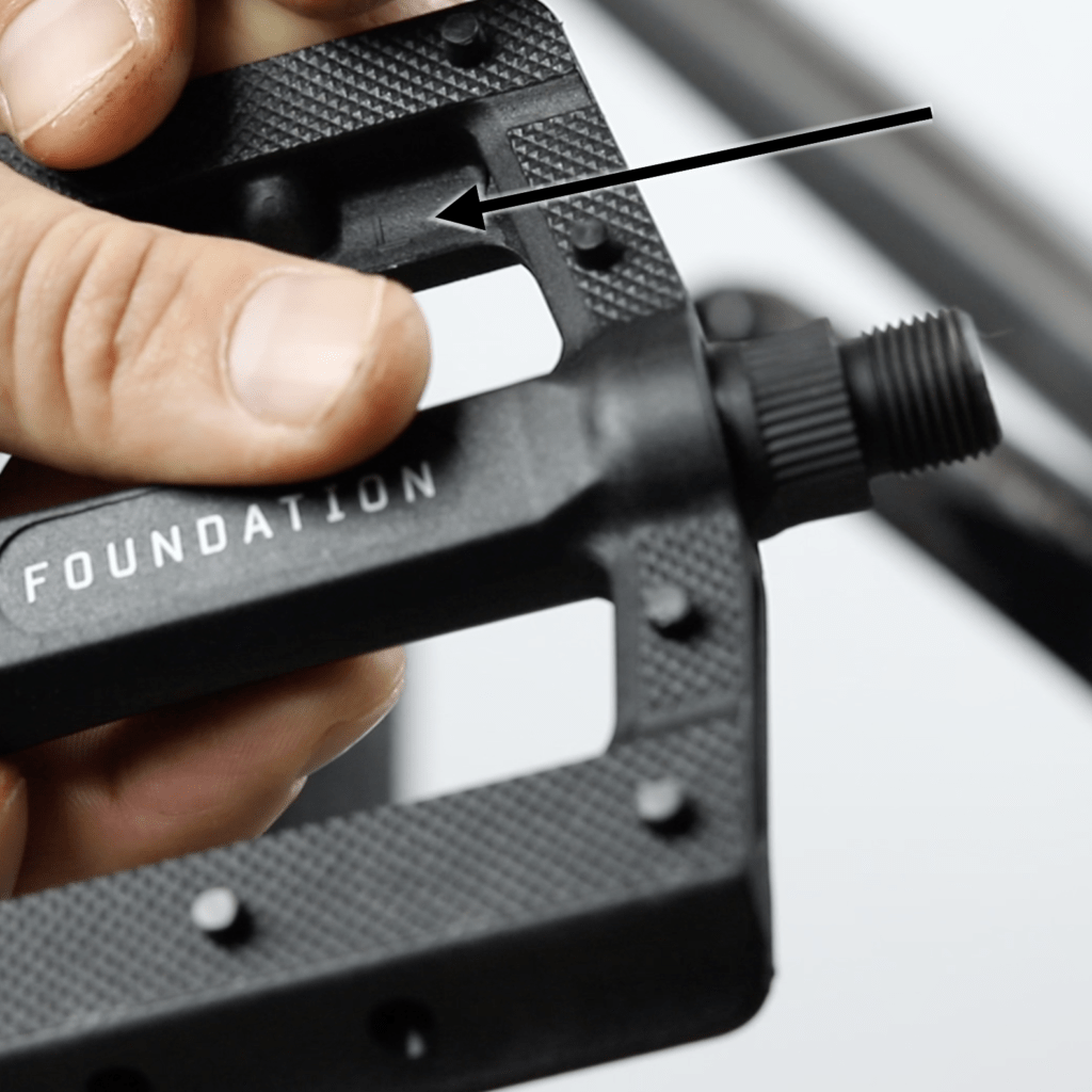- La pédale de gauche a des stries ou une marque supplémentaire sur son axe comparé à celle de droite, et/ou un L (pour left) sur le corps et / ou l’axe