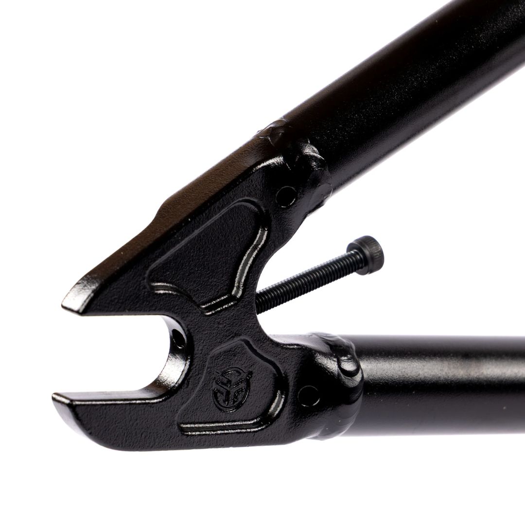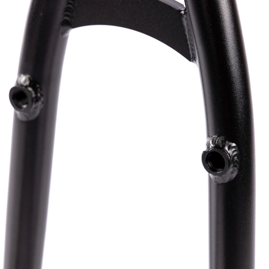 Cadre BMX avec fourche ICS2 Wishbone, pattes IC à tendeurs intégrés, renforts de direction, haubans effilés et supports de frein amovibles pour performance et style.