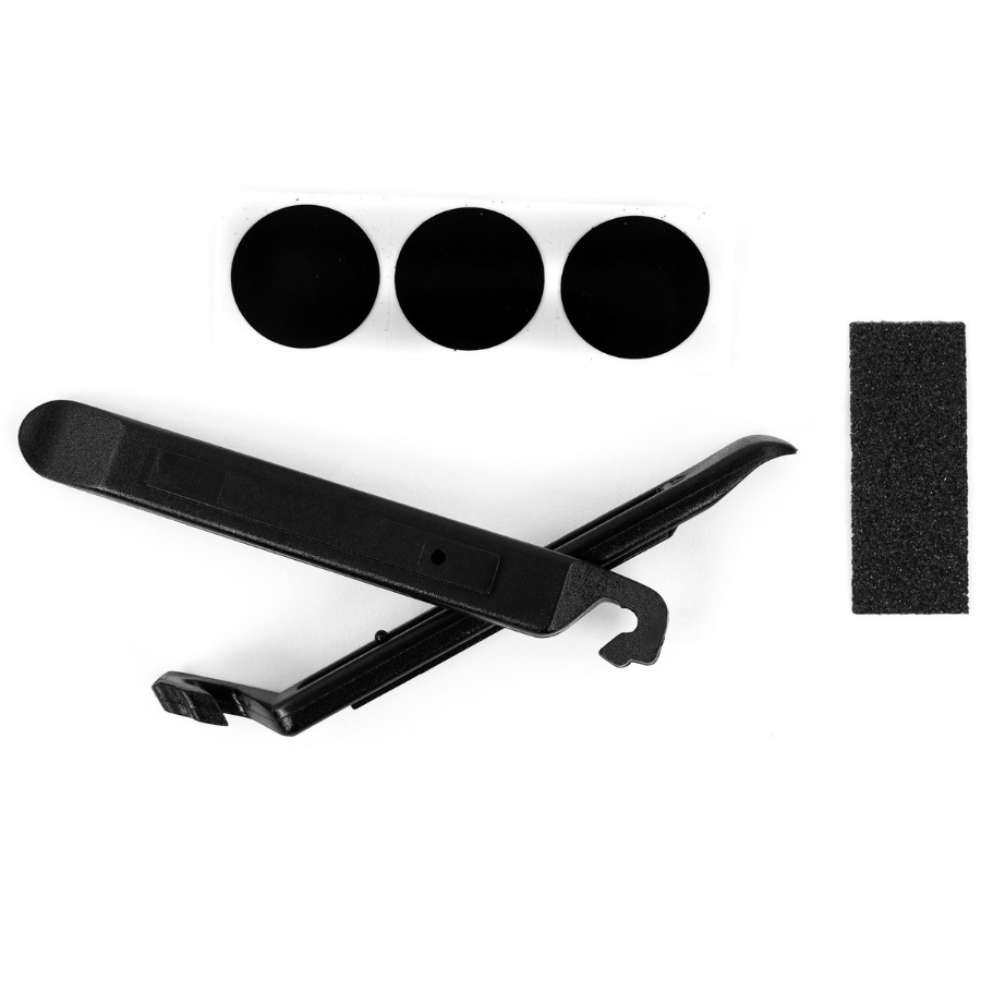 Retirez vos pneus avec le démonte-pneu inclus et réparez votre chambre à air avec le kit de 6 rustines autocollantes dans une boite en plastique.